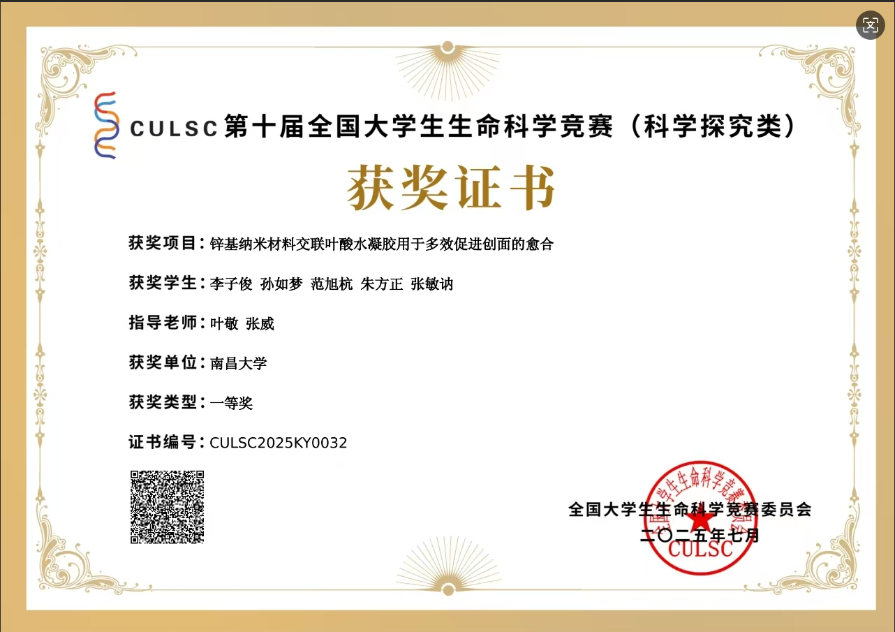 科研与创新实践,他更是带着一股钻研劲儿。他参与发表SCI论文2篇,作为项目负责人拿下第十一届“互联网 +”国际铜奖;在第十届生命科学科赛中,不仅斩获科学研究赛道全国一等奖,还拿下了创新创业赛道全国三等奖。为了拓宽学术视野,他主动参加2023年“类器官中的细胞世界”学术研讨会、第八届赣鄱整合消化病大会等各类学术活动,认真聆听专家报告、积极参与讨论,不断更新自己的知识结构和研究思维。