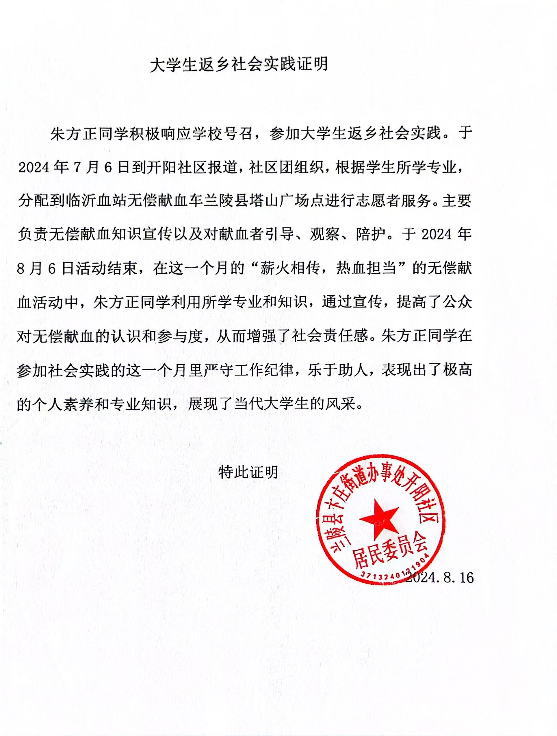 对朱方正来说,“为民服务”从不是一句口号,而是扎根在行动里的坚守。2024年暑期,他主动报名参加大学生返乡社会实践,成为临沂血站无偿献血车的一名志愿者。在献血现场,他忙着宣传无偿献血知识、引导献血者登记、维护现场秩序,还全程陪护献血后的市民。遇到有人因紧张而忐忑不安,他会轻声安抚,耐心讲解注意事项;碰到对流程有疑问的群众,他也会一遍遍细致解答,用真诚的态度让每一位献血者都感受到安心与温暖。