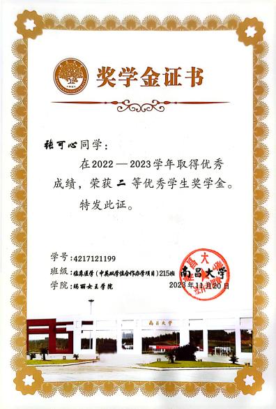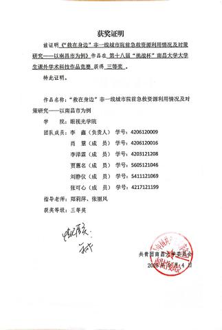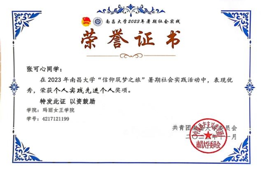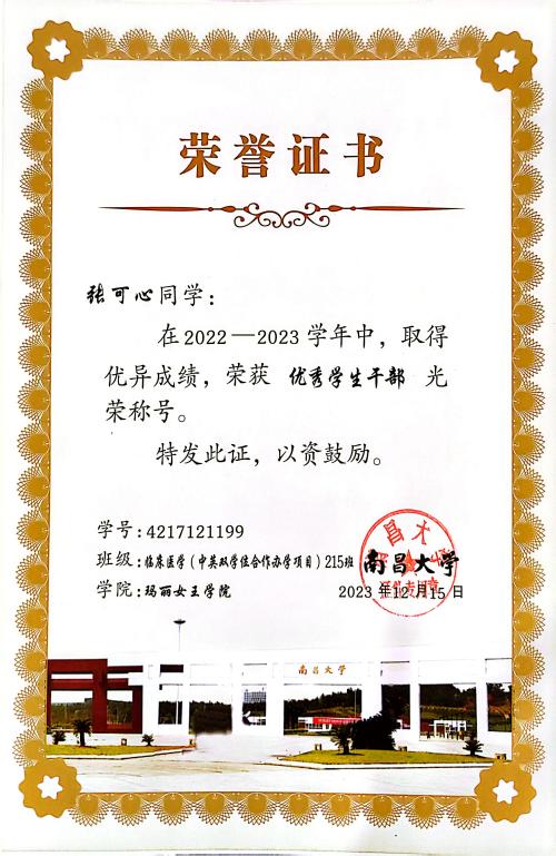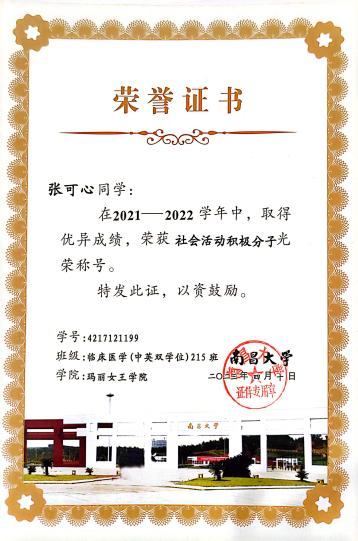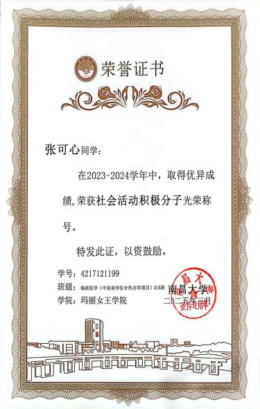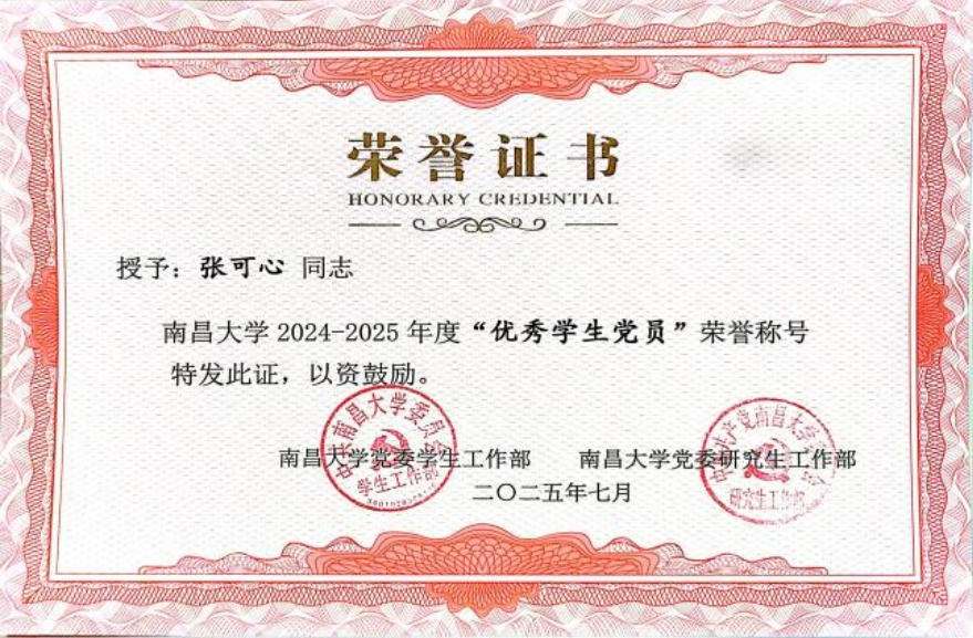 在专业学习上,张可心始终坚持高标准、严要求,注重理论学习与实践能力并重。本科期间,她学习成绩优良,综合素质突出,曾获校优秀学生奖学金,并于今年成功获得南昌大学临床医学专业硕士研究生推免资格。这一成绩的取得,是她长期专注专业学习、持续提升临床素养的必然结果。同时,她积极参与各类学科竞赛与创新实践活动,在全国大学生生命科学竞赛、“挑战杯”“互联网+”等赛事中屡获佳绩,多次获得国家级及校级奖励,以扎实的专业能力和稳定的综合表现,展现了青年医学生党员勤学善思、锐意进取的精神风貌。